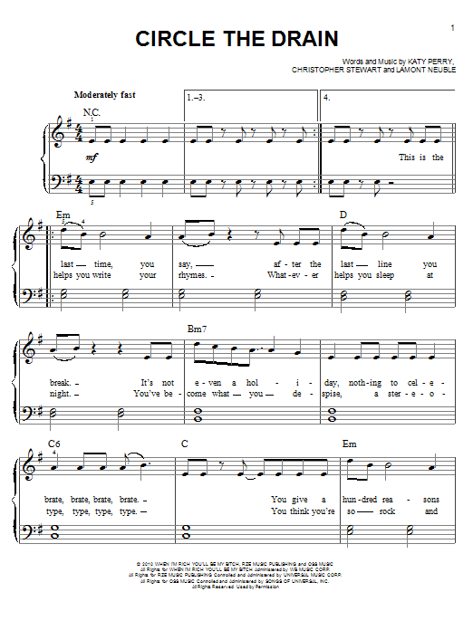 Download or print Katy Perry Circle The Drain sheet music, chords and digital score arranged for Easy Piano. This Pop score includes 4 page(s).
