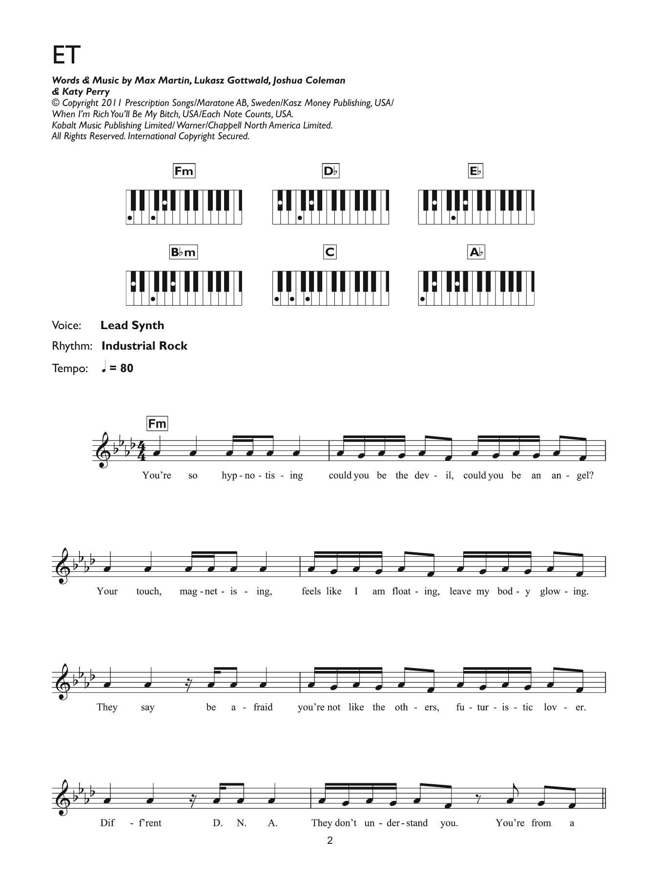 Download or print Katy Perry E.T. (featuring Kanye West) sheet music, chords and digital score arranged for Piano Chords/Lyrics. This Pop score includes 2 page(s).