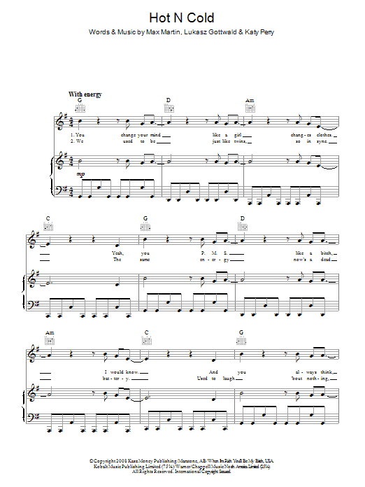Download or print Katy Perry Hot N Cold sheet music, chords and digital score arranged for Lead Sheet / Fake Book. This Pop score includes 2 page(s).