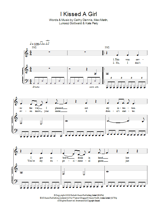 Download or print Katy Perry I Kissed A Girl sheet music, chords and digital score arranged for Drum Chart. This Pop score includes 1 page(s).