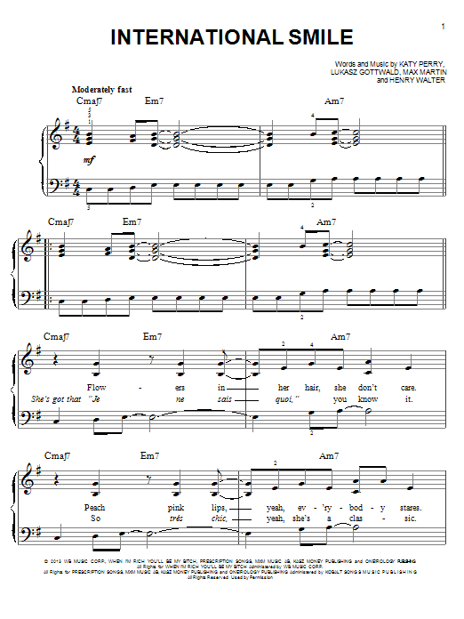 Download or print Katy Perry International Smile sheet music, chords and digital score arranged for Easy Piano. This Pop score includes 6 page(s).