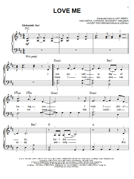 Download or print Katy Perry Love Me sheet music, chords and digital score arranged for Piano, Vocal & Guitar Chords (Right-Hand Melody). This Pop score includes 7 page(s).