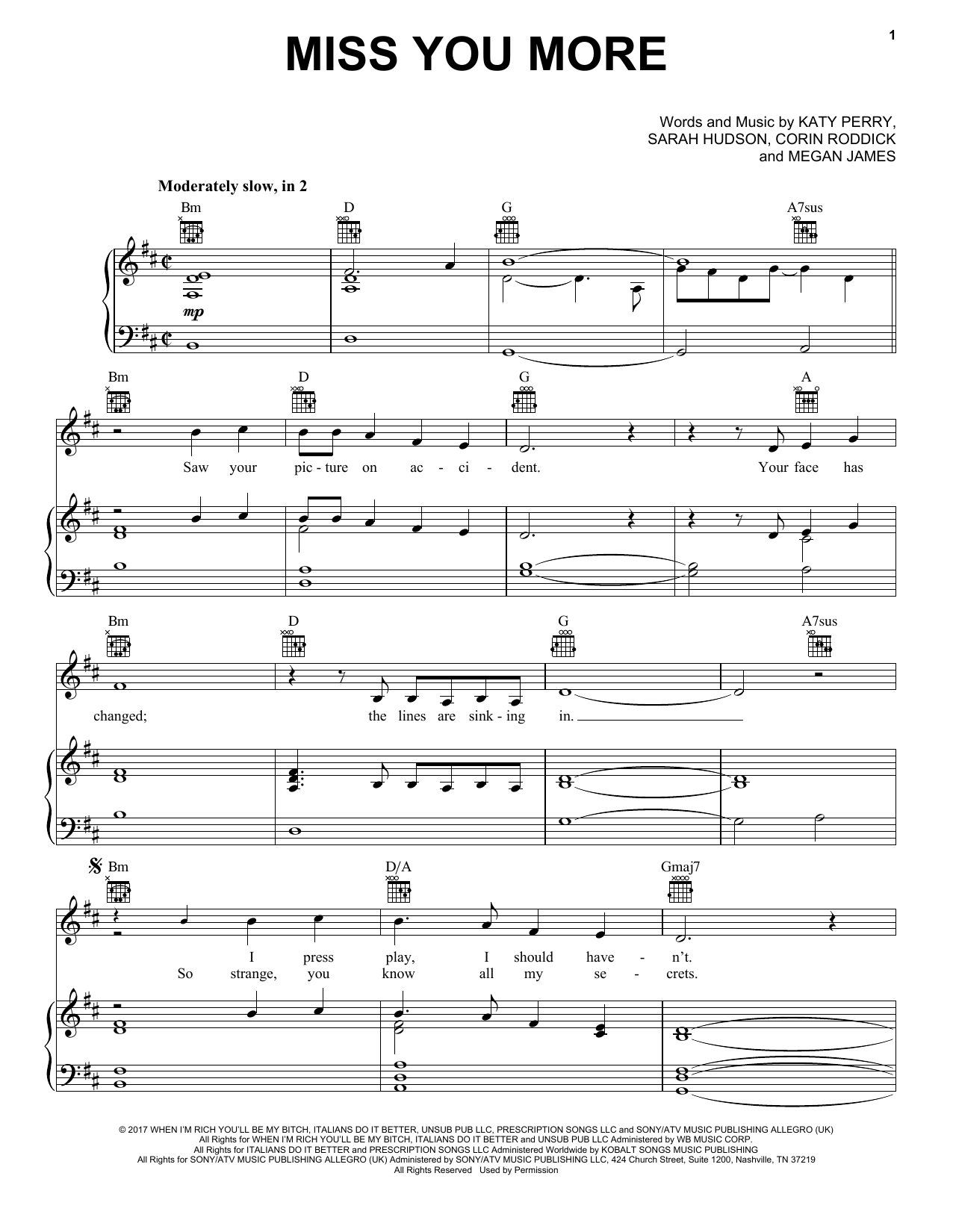 Download or print Katy Perry Miss You More sheet music, chords and digital score arranged for Piano, Vocal & Guitar Chords (Right-Hand Melody). This Pop score includes 7 page(s).