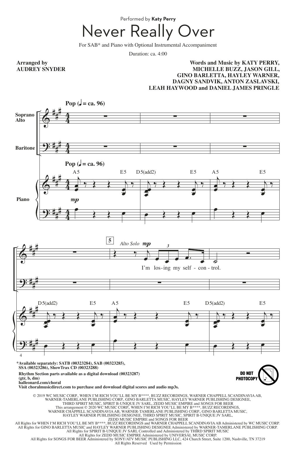 Download or print Katy Perry Never Really Over (arr. Audrey Snyder) sheet music, chords and digital score arranged for SAB Choir. This Pop score includes 15 page(s).