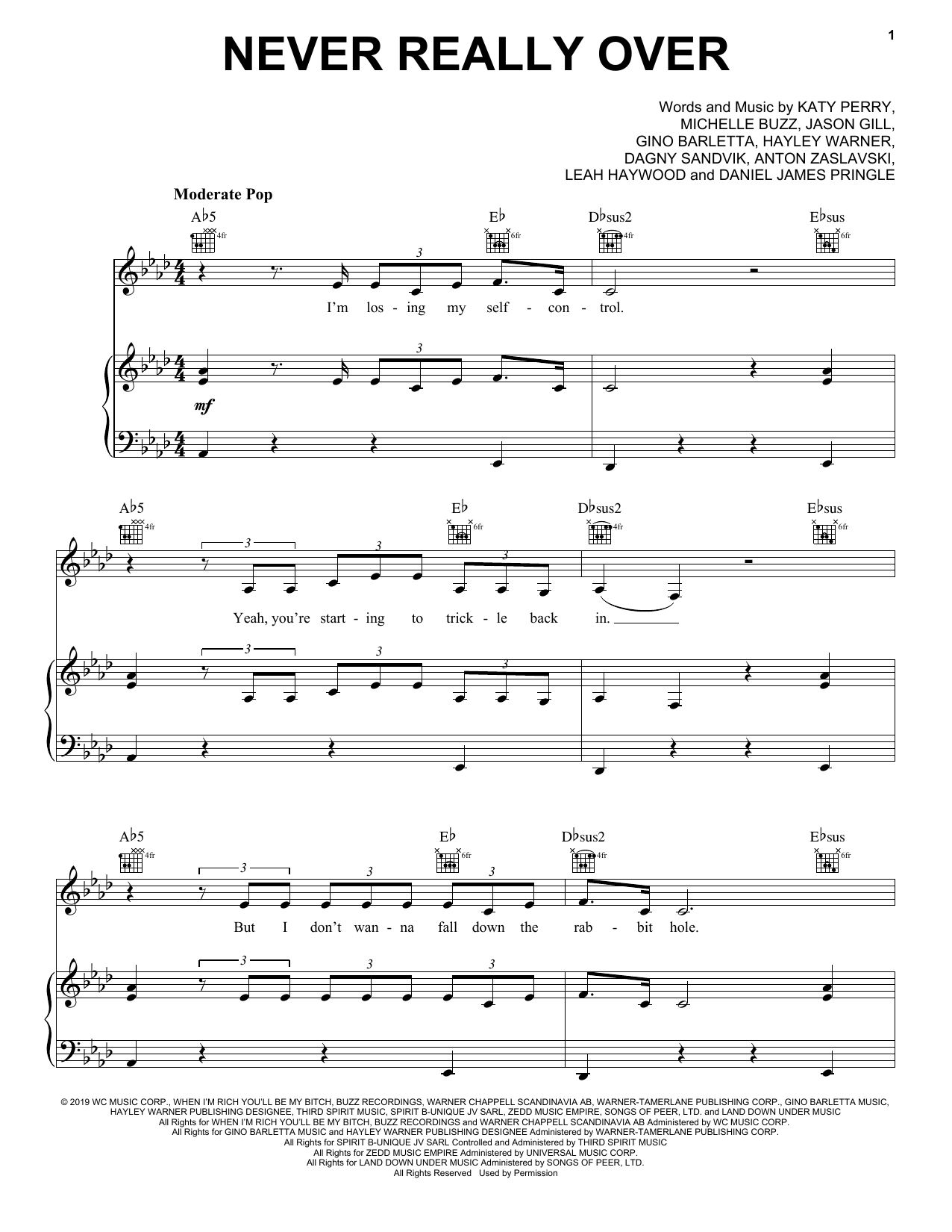 Download or print Katy Perry Never Really Over sheet music, chords and digital score arranged for Easy Piano. This Pop score includes 8 page(s).