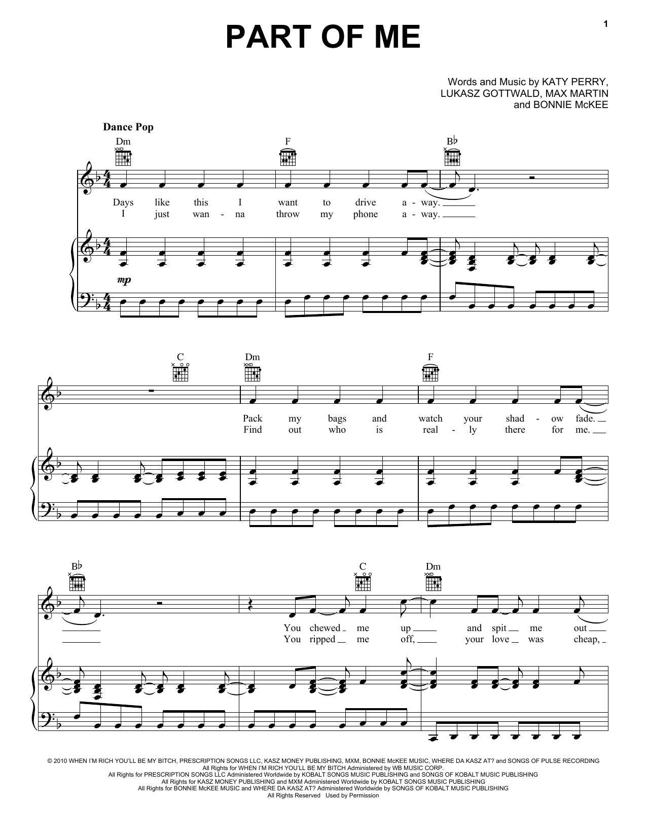 Download or print Katy Perry Part Of Me sheet music, chords and digital score arranged for Piano, Vocal & Guitar Chords. This Pop score includes 6 page(s).