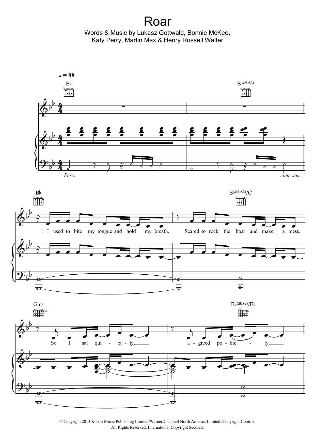 Download or print Katy Perry Roar sheet music, chords and digital score arranged for Piano Solo. This Inspirational score includes 4 page(s).