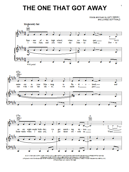 Download or print Katy Perry The One That Got Away sheet music, chords and digital score arranged for Piano, Vocal & Guitar Chords. This Pop score includes 6 page(s).