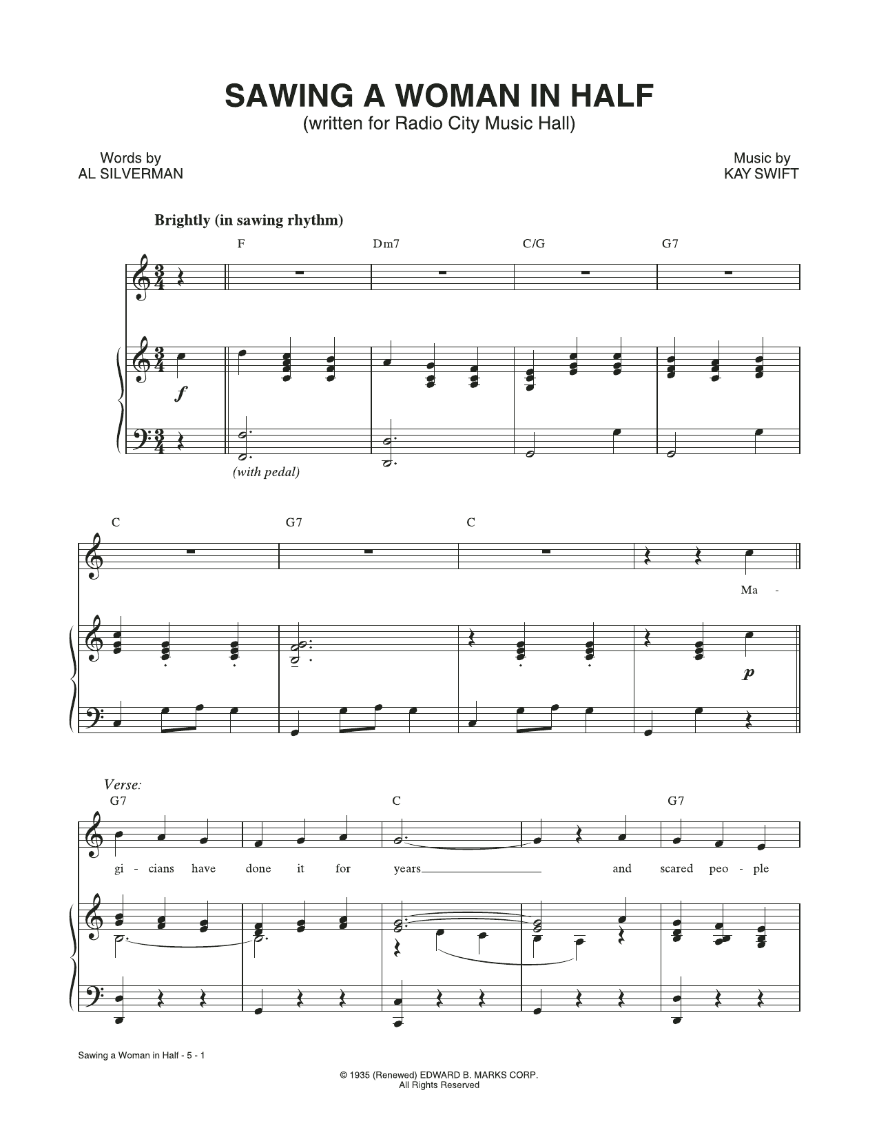 Download or print Kay Swift & Al Stillman Sawing A Woman In Half sheet music, chords and digital score arranged for Piano & Vocal. This Musical/Show score includes 6 page(s).
