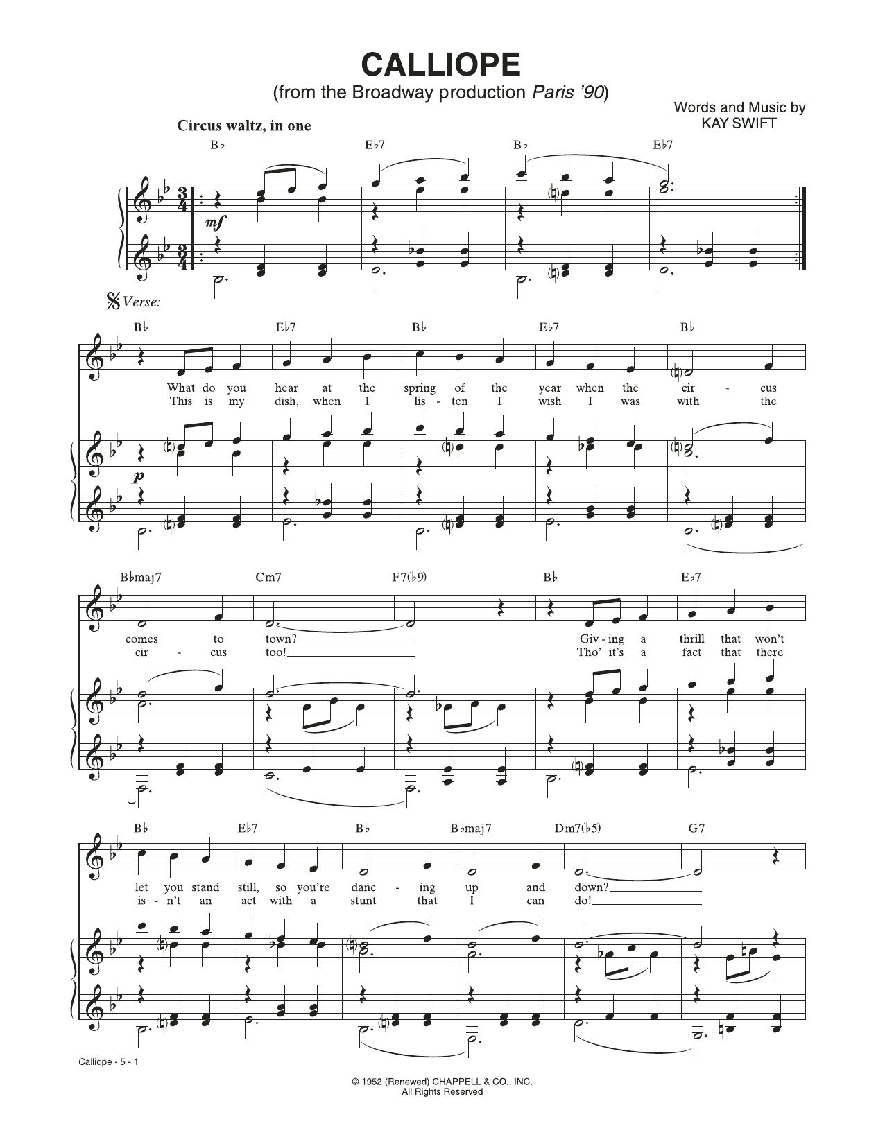 Download or print Kay Swift Calliope (from Paris '90) sheet music, chords and digital score arranged for Piano & Vocal. This Musical/Show score includes 6 page(s).