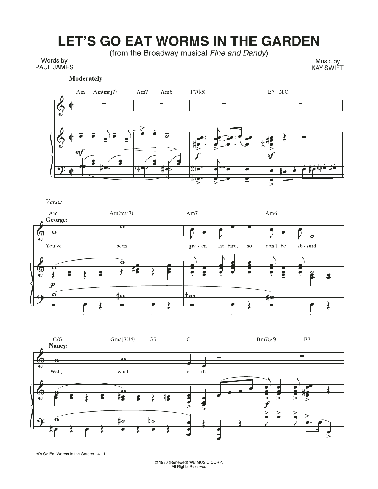 Download or print Kay Swift & Paul James Let's Go Eat Worms In The Garden (from the musical Fine and Dandy) sheet music, chords and digital score arranged for Piano & Vocal. This Musical/Show score includes 5 page(s).