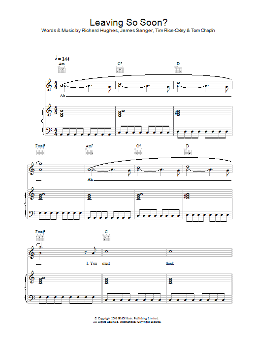 Download or print Keane Leaving So Soon? sheet music, chords and digital score arranged for Piano, Vocal & Guitar Chords. This Pop score includes 4 page(s).