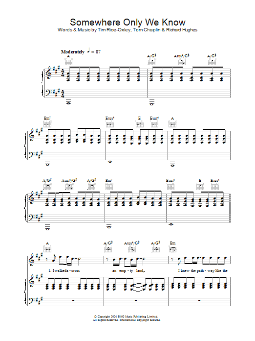 Download or print Keane Somewhere Only We Know sheet music, chords and digital score arranged for Piano Chords/Lyrics. This Pop score includes 2 page(s).