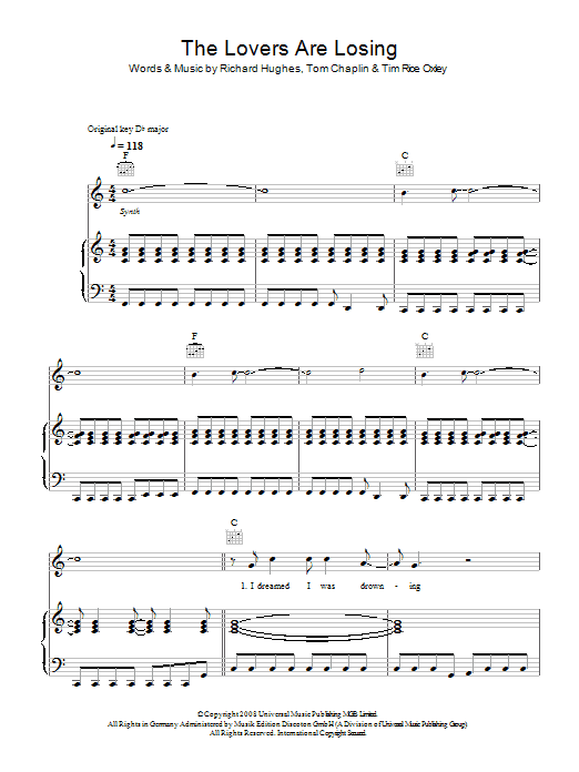 Download or print Keane The Lovers Are Losing sheet music, chords and digital score arranged for Piano, Vocal & Guitar Chords. This Pop score includes 7 page(s).