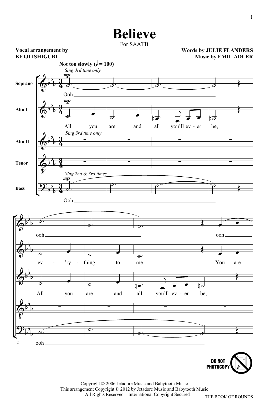 Download or print Keiji Ishiguri Believe sheet music, chords and digital score arranged for SATB Choir. This Warm-up score includes 7 page(s).