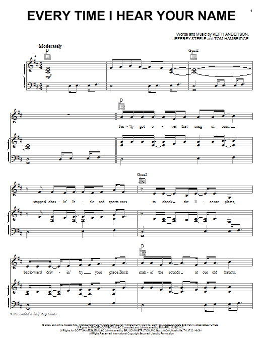 Download or print Keith Anderson Every Time I Hear Your Name sheet music, chords and digital score arranged for Piano, Vocal & Guitar Chords (Right-Hand Melody). This Country score includes 9 page(s).