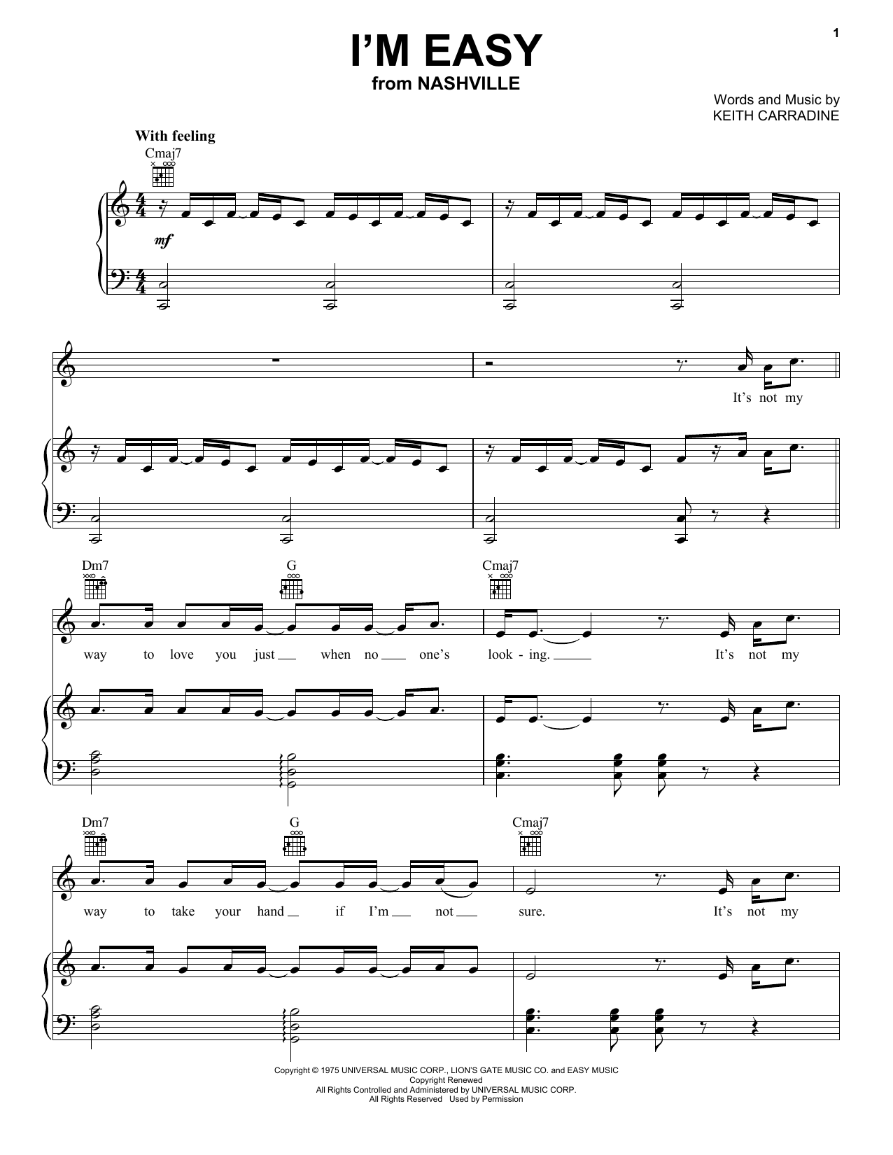 Download or print Keith Carradine I'm Easy sheet music, chords and digital score arranged for Piano, Vocal & Guitar Chords (Right-Hand Melody). This Country score includes 6 page(s).