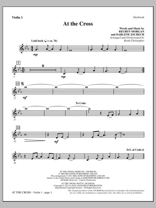Download or print Keith Christopher At The Cross - Violin 1 sheet music, chords and digital score arranged for Choir Instrumental Pak. This Christian score includes 2 page(s).