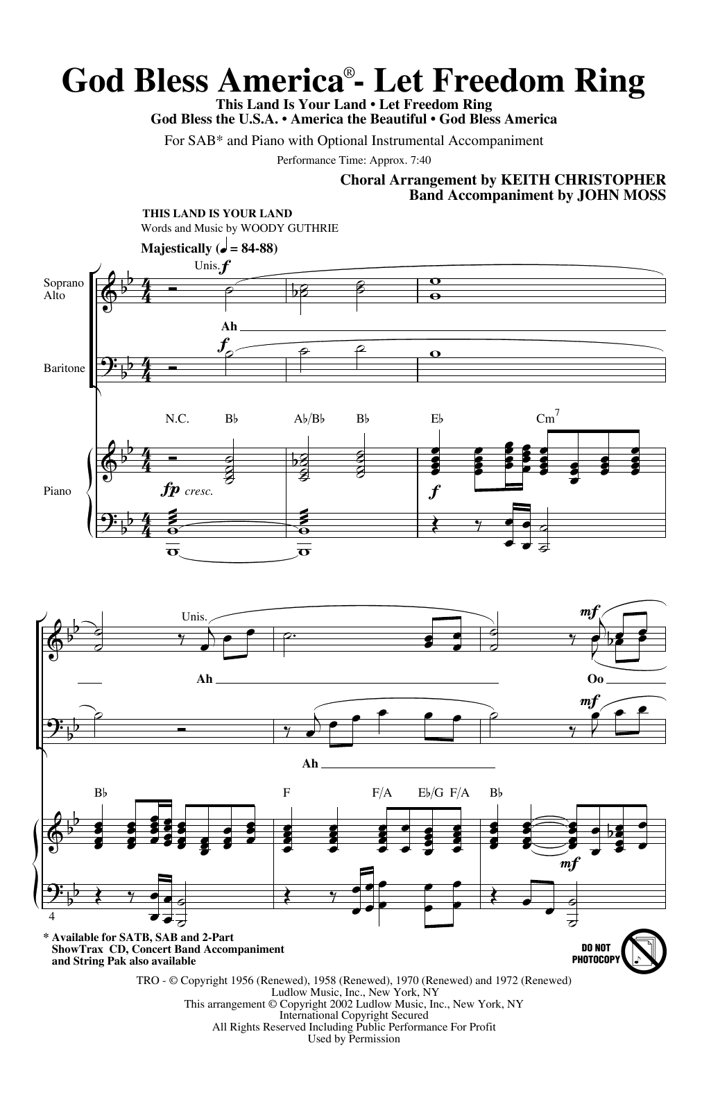 Download or print Keith Christopher God Bless America (Let Freedom Ring) (Medley) sheet music, chords and digital score arranged for 2-Part Choir. This Patriotic score includes 23 page(s).