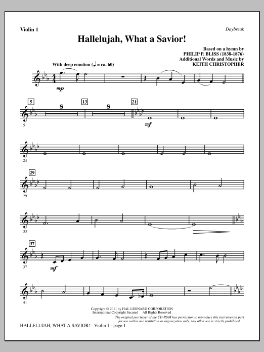 Download or print Keith Christopher Hallelujah, What A Savior! - Violin 1 sheet music, chords and digital score arranged for Choir Instrumental Pak. This Easter score includes 3 page(s).