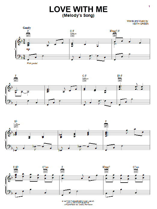 Download or print Keith Green Love With Me (Melody's Song) sheet music, chords and digital score arranged for Piano, Vocal & Guitar Chords (Right-Hand Melody). This Christian score includes 6 page(s).