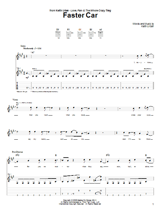 Download or print Keith Urban Faster Car sheet music, chords and digital score arranged for Piano, Vocal & Guitar Chords (Right-Hand Melody). This Country score includes 8 page(s).