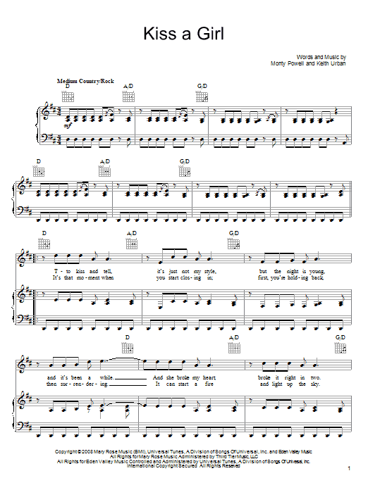Download or print Keith Urban Kiss A Girl sheet music, chords and digital score arranged for Guitar Tab. This Country score includes 20 page(s).