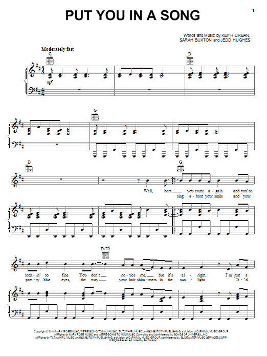 Download or print Keith Urban Put You In A Song sheet music, chords and digital score arranged for Guitar Chords/Lyrics. This Pop score includes 4 page(s).