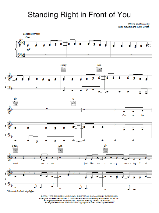 Download or print Keith Urban Standing Right In Front Of You sheet music, chords and digital score arranged for Piano, Vocal & Guitar Chords (Right-Hand Melody). This Country score includes 8 page(s).