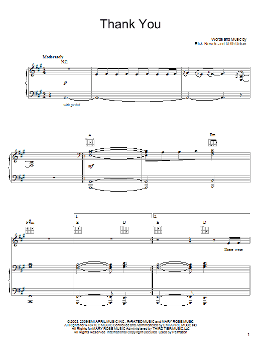 Download or print Keith Urban Thank You sheet music, chords and digital score arranged for Piano, Vocal & Guitar Chords (Right-Hand Melody). This Country score includes 12 page(s).