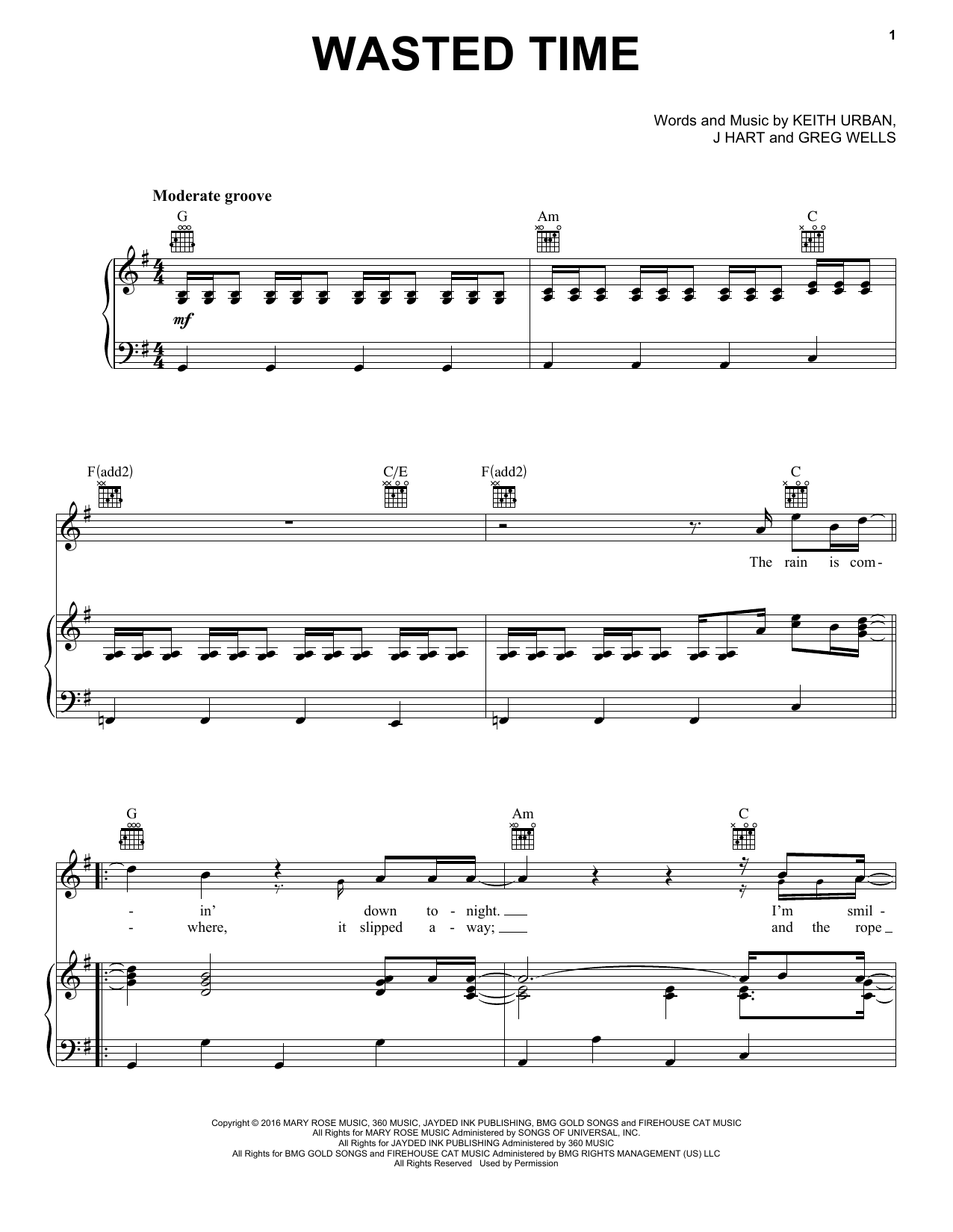 Download or print Keith Urban Wasted Time sheet music, chords and digital score arranged for Piano, Vocal & Guitar Chords (Right-Hand Melody). This Pop score includes 6 page(s).