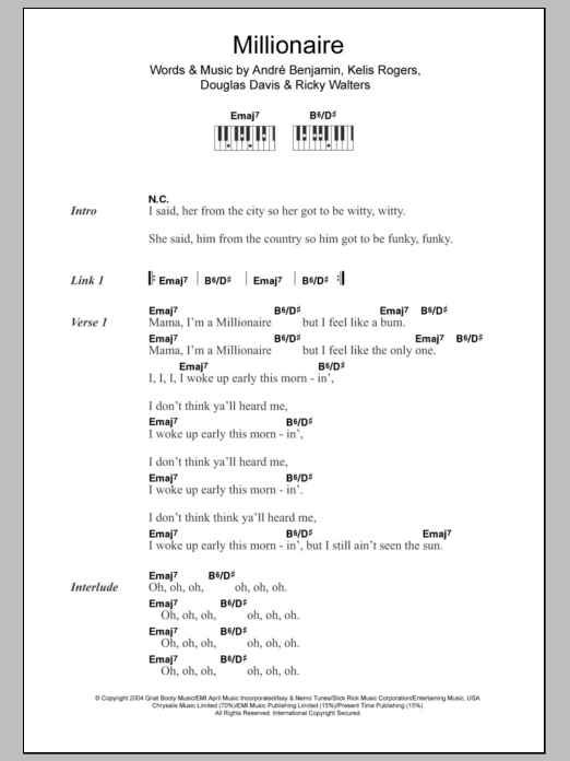 Download or print Kelis Millionaire (feat. André 3000) sheet music, chords and digital score arranged for Guitar Chords/Lyrics. This R & B score includes 3 page(s).