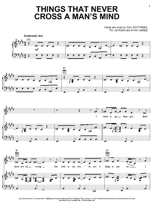Download or print Kellie Pickler Things That Never Cross A Man's Mind sheet music, chords and digital score arranged for Piano, Vocal & Guitar Chords (Right-Hand Melody). This Country score includes 5 page(s).