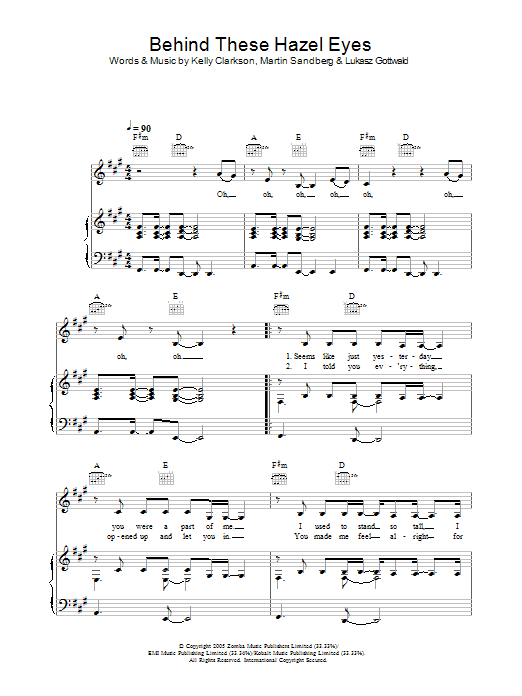 Download or print Kelly Clarkson Behind These Hazel Eyes sheet music, chords and digital score arranged for Piano, Vocal & Guitar Chords (Right-Hand Melody). This Film/TV score includes 5 page(s).