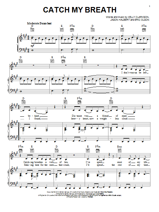 Download or print Kelly Clarkson Catch My Breath sheet music, chords and digital score arranged for Piano, Vocal & Guitar Chords (Right-Hand Melody). This Pop score includes 6 page(s).