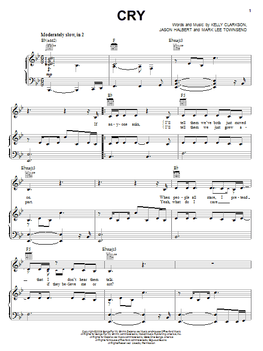 Download or print Kelly Clarkson Cry sheet music, chords and digital score arranged for Piano, Vocal & Guitar Chords (Right-Hand Melody). This Pop score includes 5 page(s).