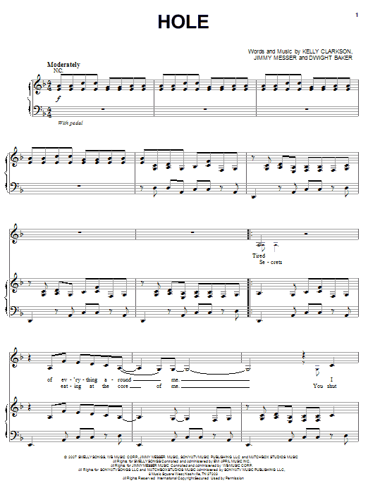 Download or print Kelly Clarkson Hole sheet music, chords and digital score arranged for Piano, Vocal & Guitar Chords (Right-Hand Melody). This Pop score includes 6 page(s).