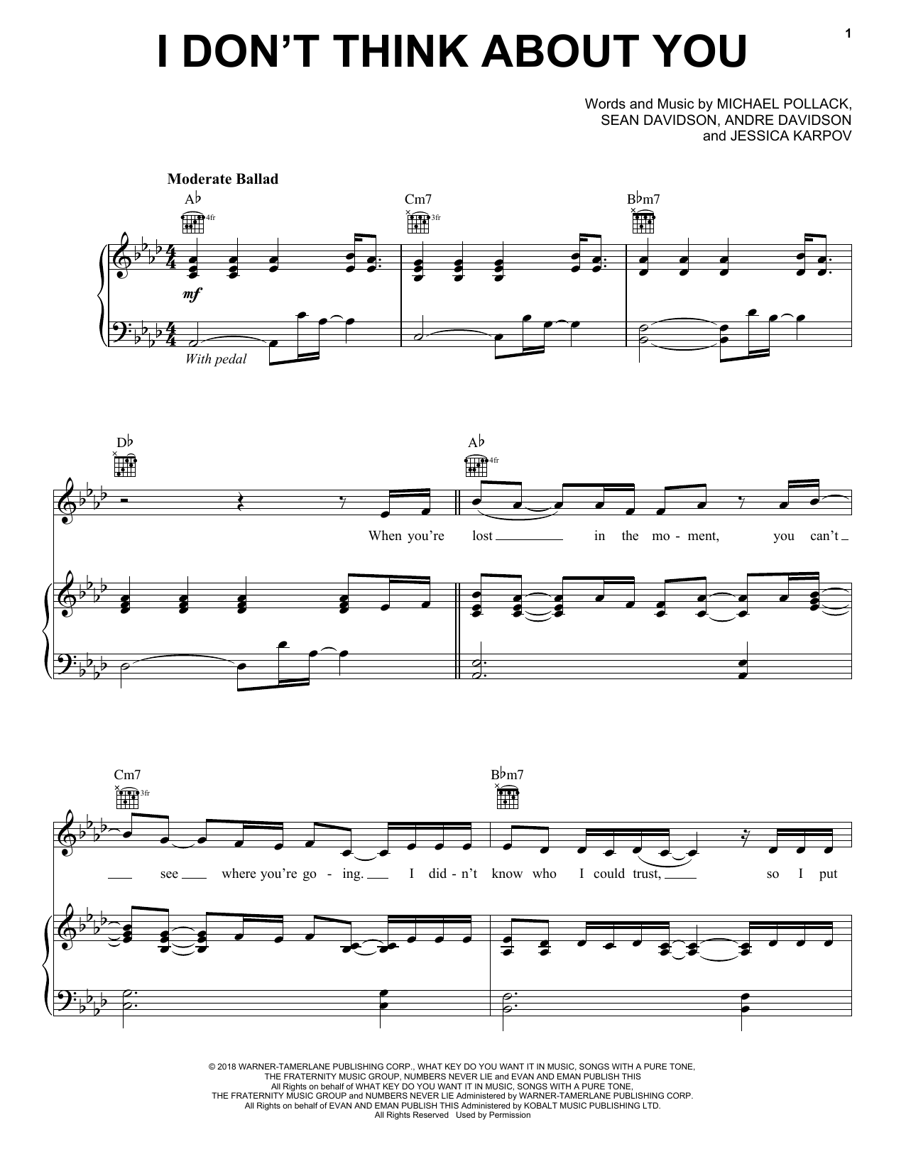 Download or print Kelly Clarkson I Don't Think About You sheet music, chords and digital score arranged for Piano, Vocal & Guitar Chords (Right-Hand Melody). This Pop score includes 7 page(s).
