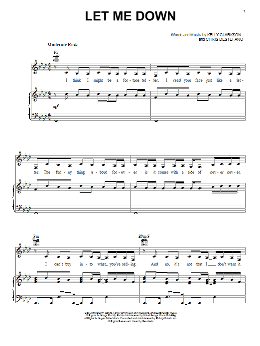 Download or print Kelly Clarkson Let Me Down sheet music, chords and digital score arranged for Piano, Vocal & Guitar Chords (Right-Hand Melody). This Pop score includes 6 page(s).