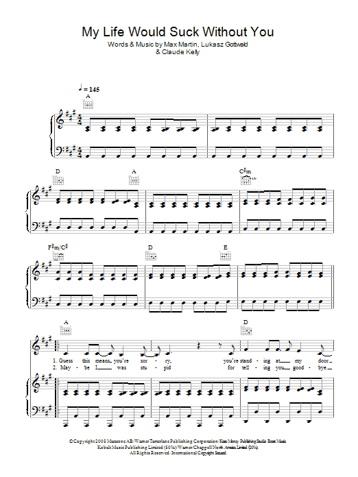 Download or print Kelly Clarkson My Life Would Suck Without You sheet music, chords and digital score arranged for Piano Chords/Lyrics. This Pop score includes 2 page(s).
