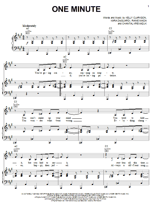 Download or print Kelly Clarkson One Minute sheet music, chords and digital score arranged for Piano, Vocal & Guitar Chords (Right-Hand Melody). This Pop score includes 5 page(s).