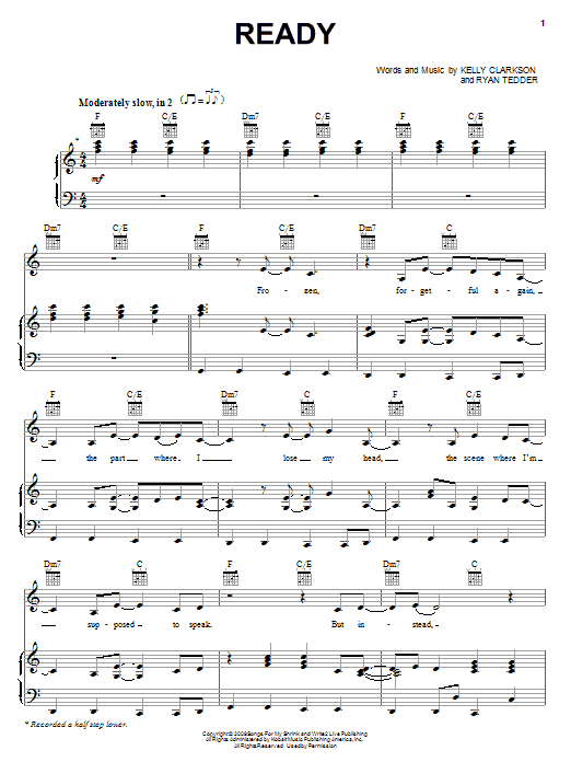 Download or print Kelly Clarkson Ready sheet music, chords and digital score arranged for Piano, Vocal & Guitar Chords (Right-Hand Melody). This Pop score includes 6 page(s).