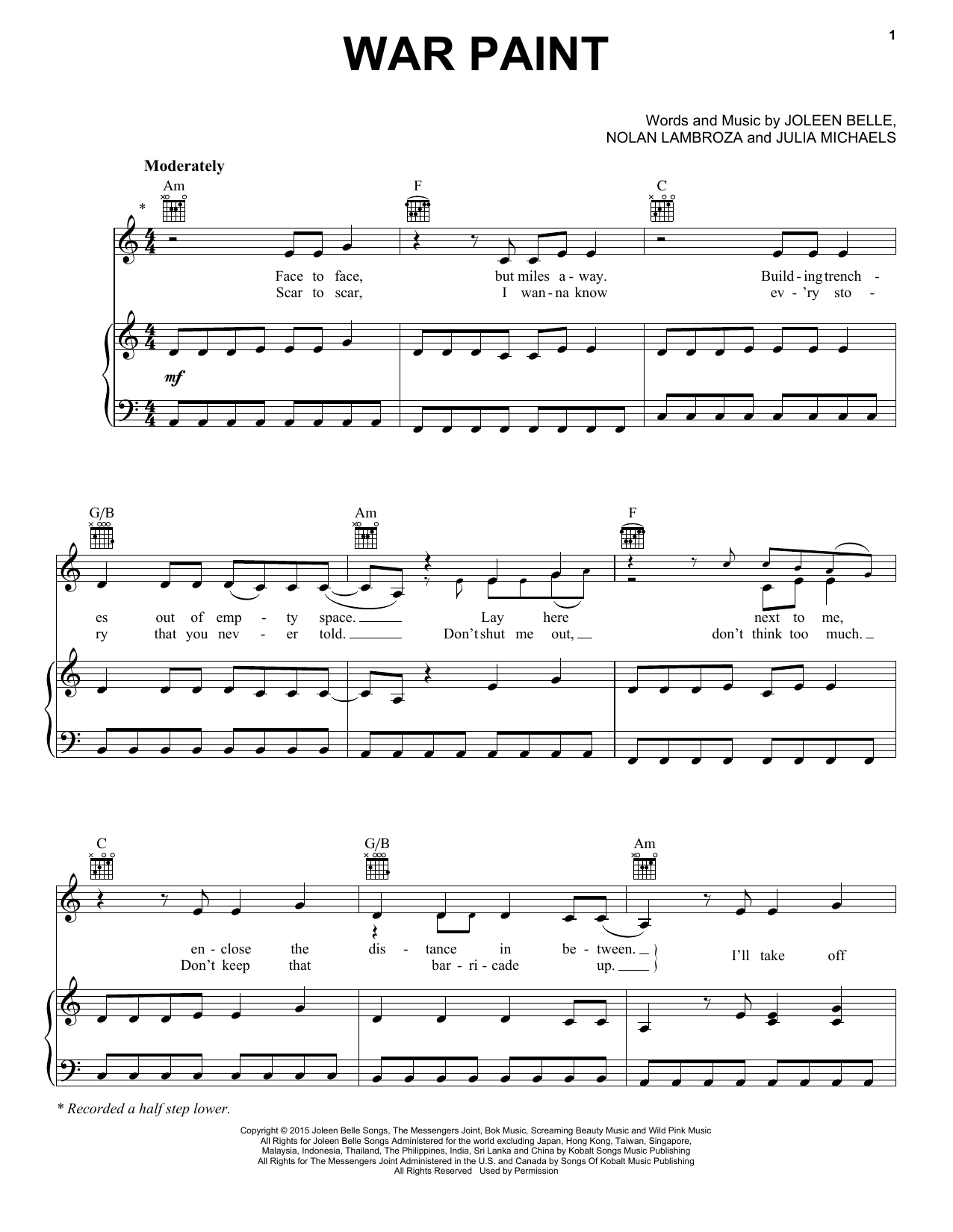 Download or print Kelly Clarkson War Paint sheet music, chords and digital score arranged for Piano, Vocal & Guitar Chords (Right-Hand Melody). This Pop score includes 6 page(s).