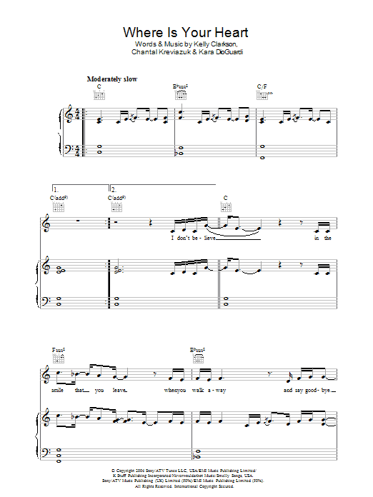 Download or print Kelly Clarkson Where Is Your Heart sheet music, chords and digital score arranged for Piano, Vocal & Guitar Chords (Right-Hand Melody). This Pop score includes 9 page(s).