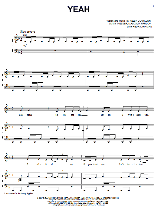 Download or print Kelly Clarkson Yeah sheet music, chords and digital score arranged for Piano, Vocal & Guitar Chords (Right-Hand Melody). This Pop score includes 6 page(s).