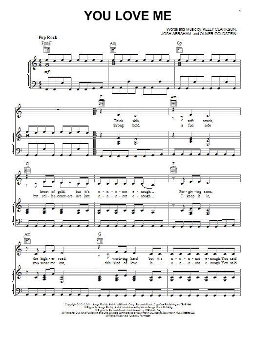 Download or print Kelly Clarkson You Love Me sheet music, chords and digital score arranged for Piano, Vocal & Guitar Chords (Right-Hand Melody). This Pop score includes 6 page(s).