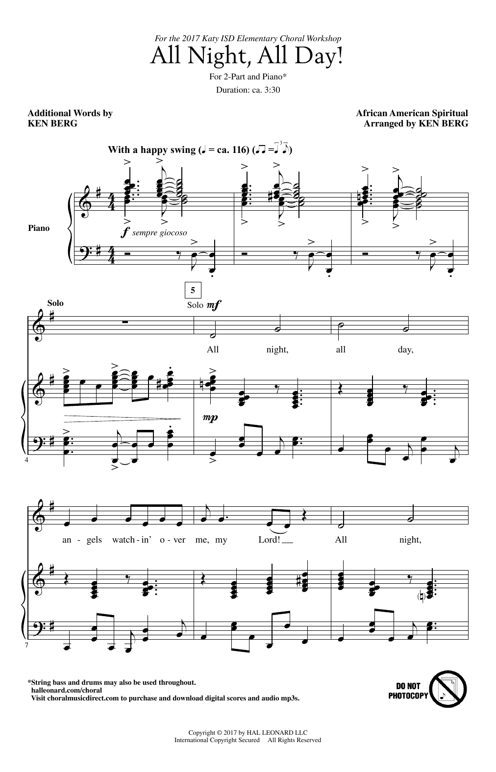 Download or print Ken Berg All Night, All Day sheet music, chords and digital score arranged for 2-Part Choir. This Concert score includes 13 page(s).