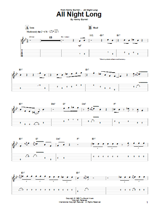 Download or print Kenny Burrell All Night Long sheet music, chords and digital score arranged for Guitar Tab. This Jazz score includes 13 page(s).