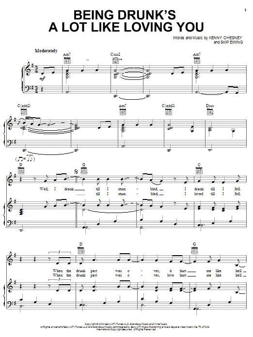 Download or print Kenny Chesney Being Drunk's A Lot Like Loving You sheet music, chords and digital score arranged for Piano, Vocal & Guitar Chords (Right-Hand Melody). This Country score includes 5 page(s).