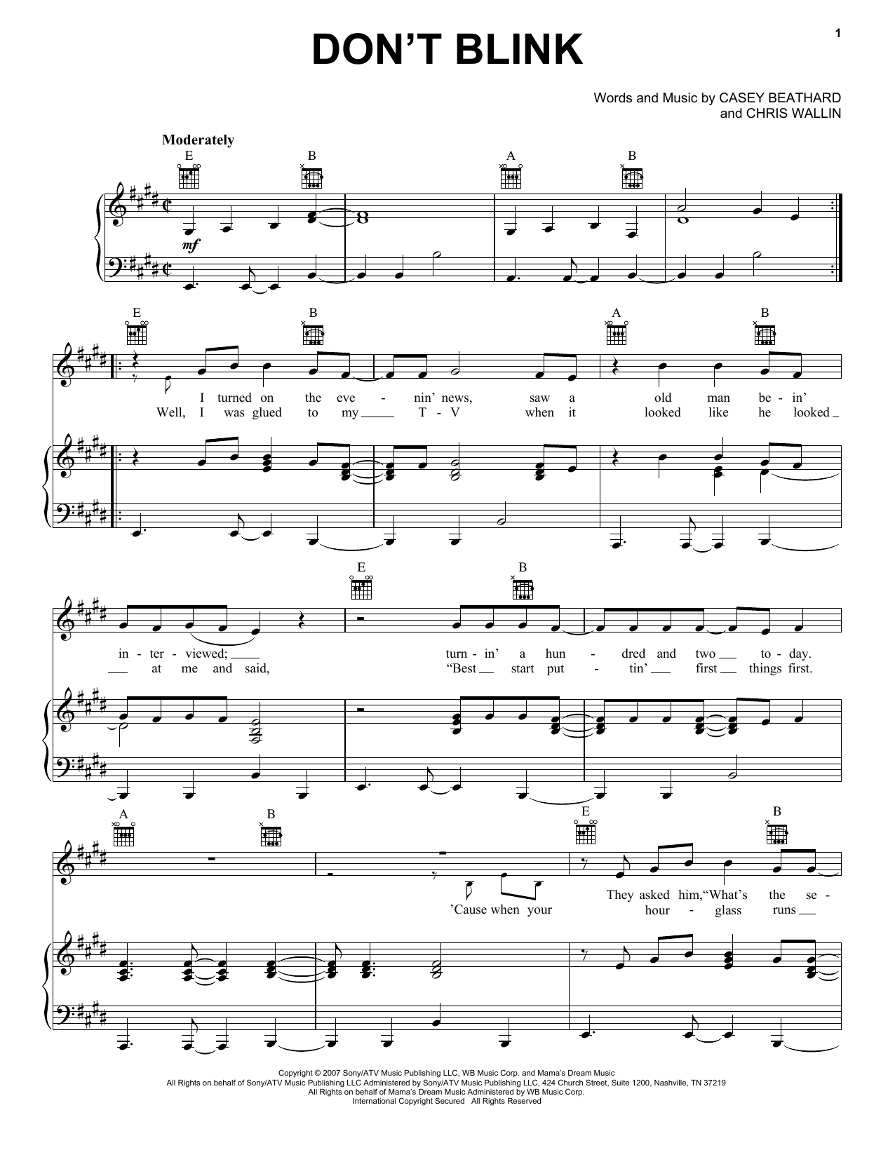 Download or print Kenny Chesney Don't Blink sheet music, chords and digital score arranged for Piano, Vocal & Guitar Chords (Right-Hand Melody). This Country score includes 7 page(s).